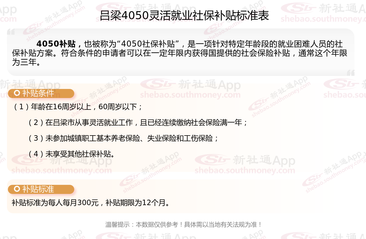 一、2025年吕梁灵活就业4050社保补贴标准最新是多少?