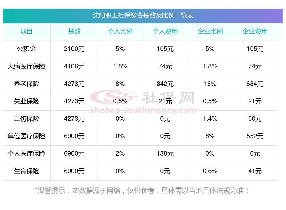 沈阳缴费社保比例一览 社保公司和个人各交多少?下表是2024-2025年沈阳社保费用明细参考,新社通app-社保缴费查询工具提供的最新数据如下:
