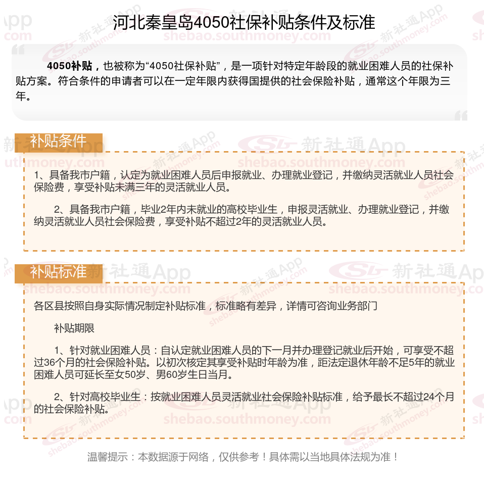今天聊一下4050补贴的相关内容。4050补贴听起来像是一个针对特定年龄人群的社保补贴。比如女性需年满40周岁,男性需年满50周岁(以申请当年12月31日为截止日期)。那么河北秦皇岛4050灵活就业困难人员社保补贴多少钱?河北秦皇岛4050社保补贴可以申请吗?接下来随新社通APP小编具体了解一下4050社保补贴内容。