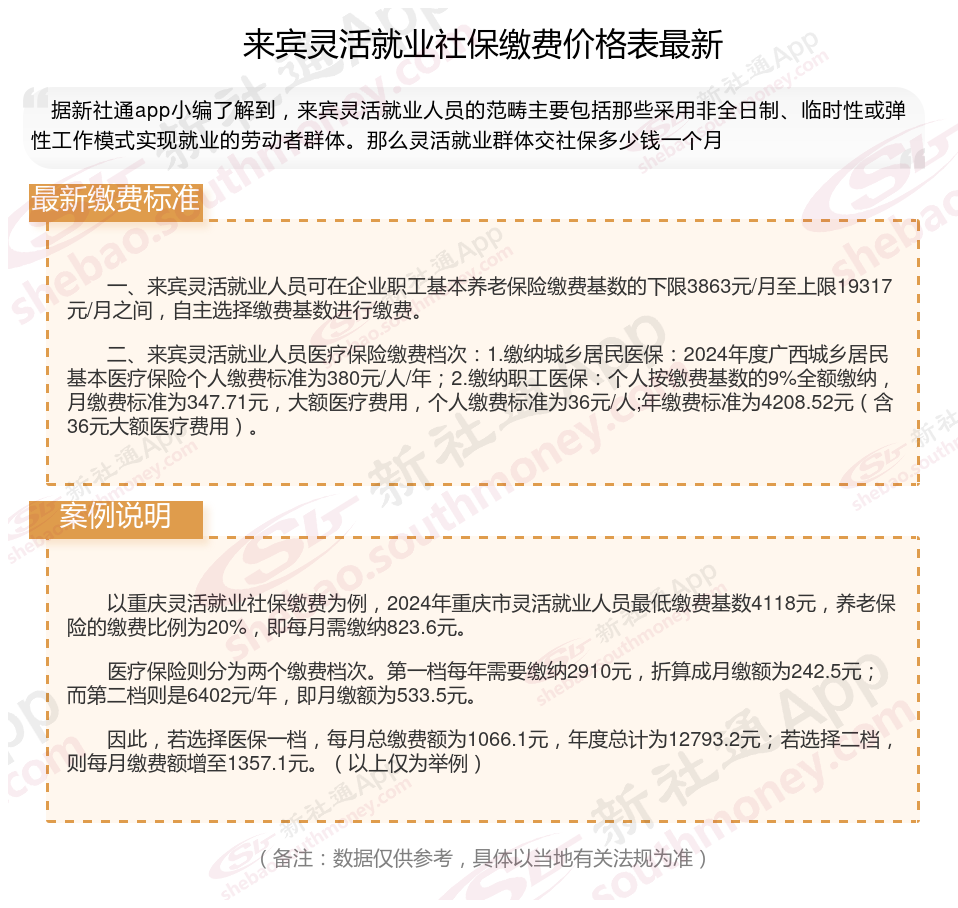 一、2024年来宾灵活就业社保缴费标准表 来宾灵活就业社保多少钱一个月?