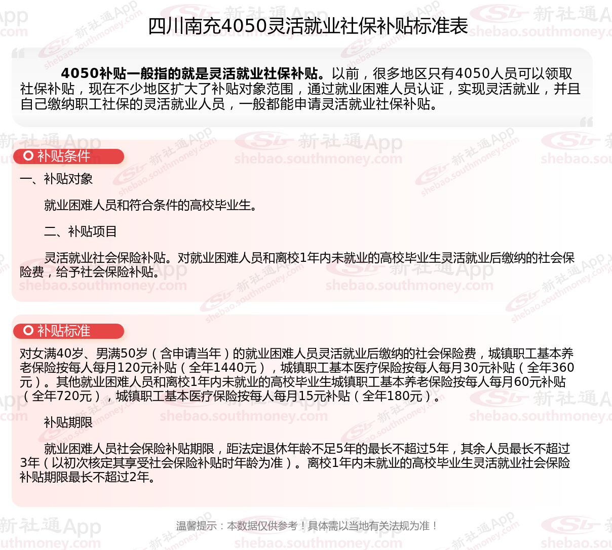 以上就是四川南充4050灵活就业社保补贴的相关内容,欢迎关注新社通/下载新社通APP了解更多五险一金专业资讯。