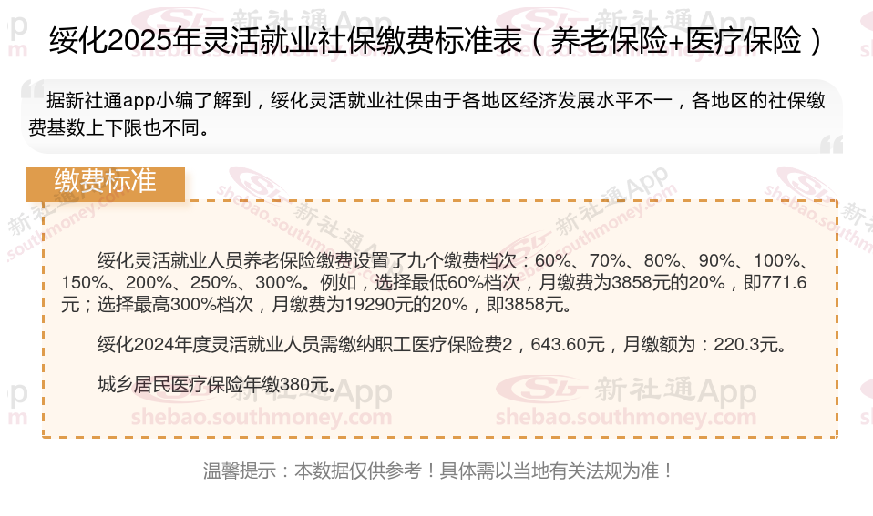 据新社通app数据显示,2024-2025年绥化灵活就业人员养老保险的缴费标准是根据缴费基数来确定的: