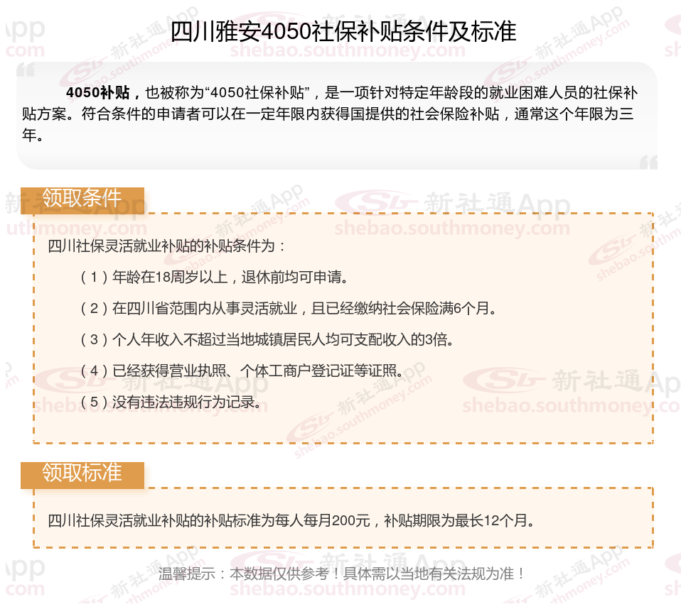 一、四川雅安4050社保补贴标准及条件2025年最新消息