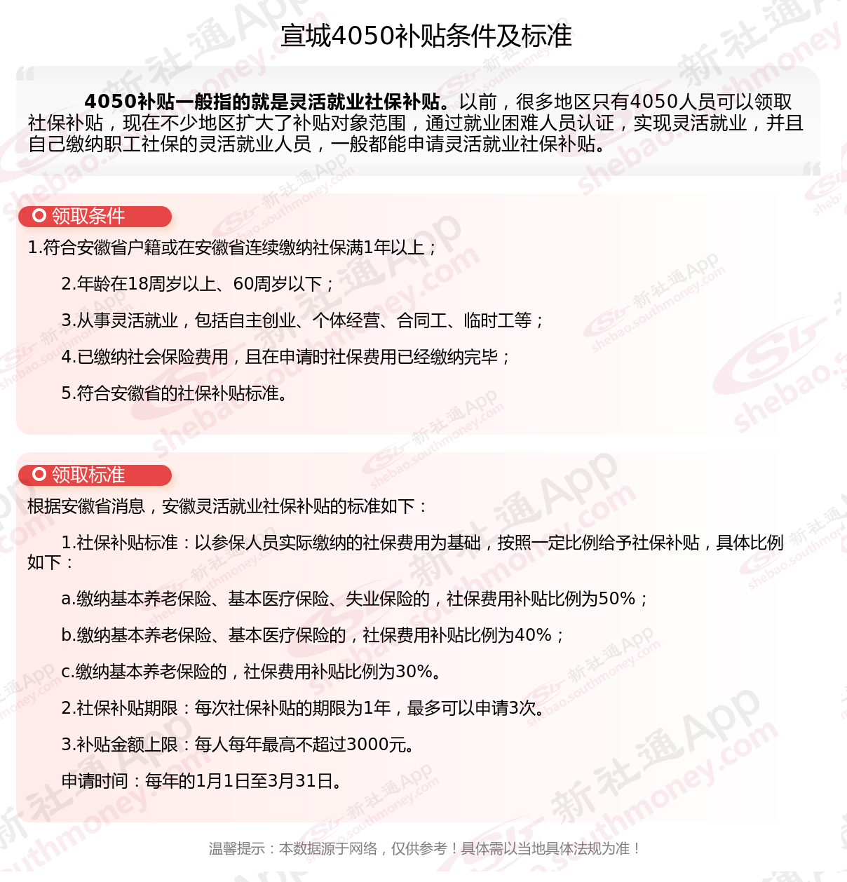 二、2025年宣城4050社保补贴标准(宣城4050灵活就业人员补贴标准是多少钱?宣城2025年4050补贴新规能领多少钱?)