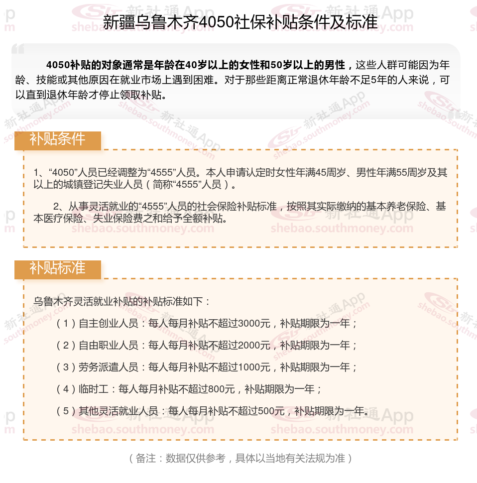 一、新疆乌鲁木齐4050社保补贴标准及条件是多少?