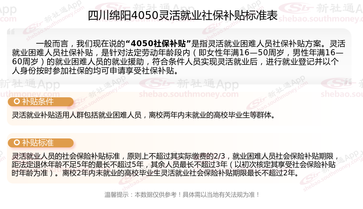 二、四川绵阳4050社保补贴多少钱一个月?四川绵阳4050社保补贴2025年最新标准是多少?