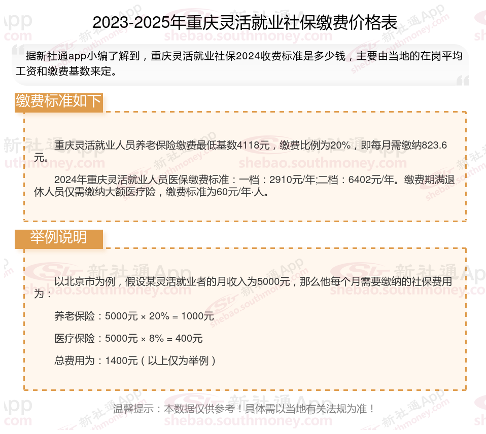 据新社通app数据显示,重庆灵活就业养老保险缴费基数2024-2025年最新标准如下: