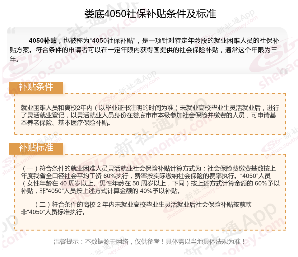 一、2023-2024年娄底4050社保补贴标准及条件是多少?