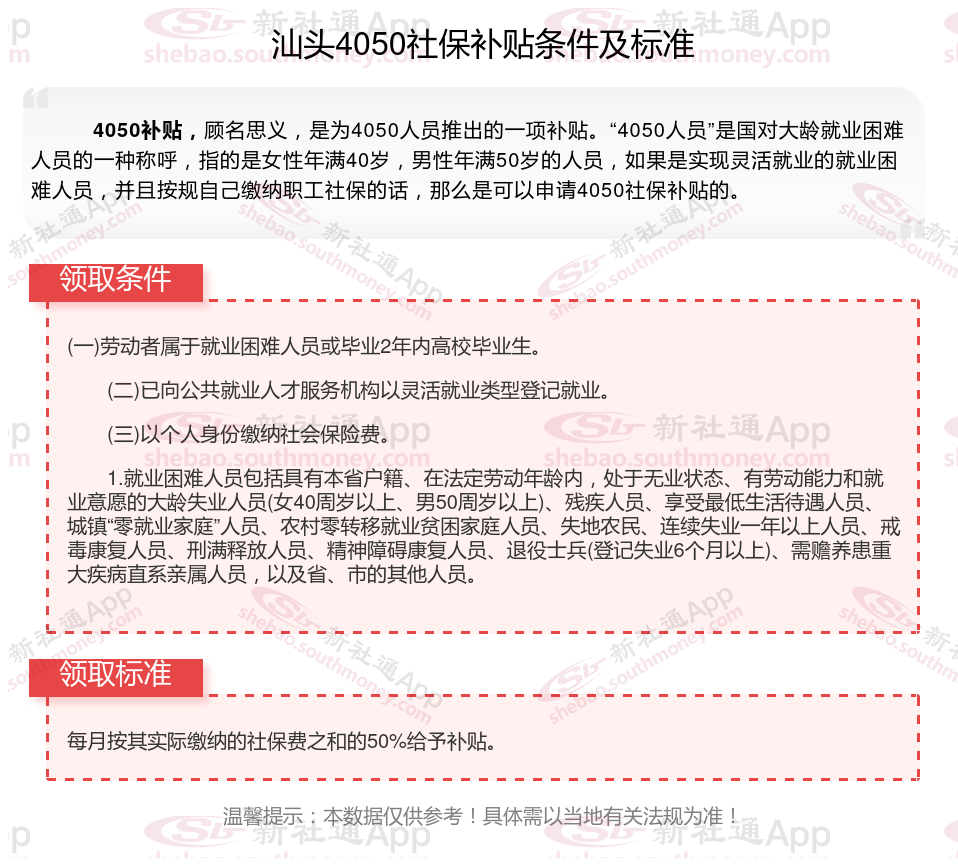 一、汕头4050社保补贴标准及条件2025年最新消息