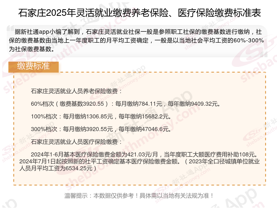 一、2024-2025年石家庄灵活就业社保缴费标准表 石家庄灵活就业社保多少钱一个月?