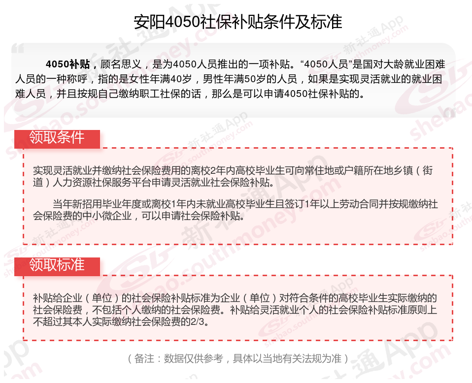 三、安阳灵活就业4050社保补贴标准及条件是什么