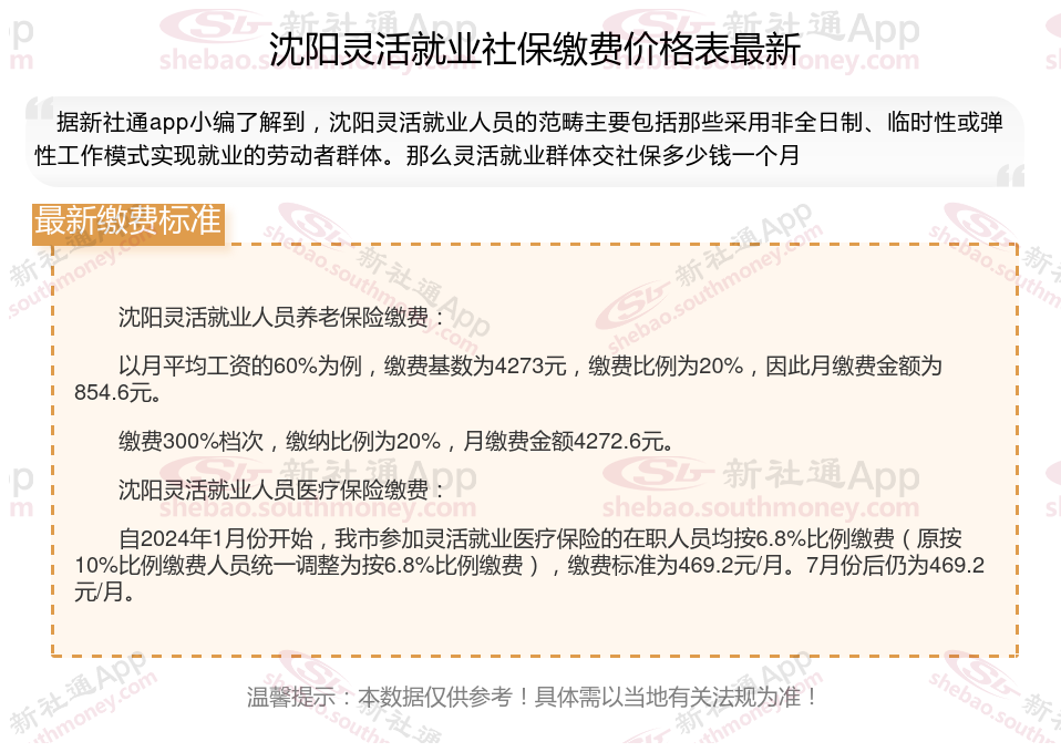 据新社通app数据显示,沈阳灵活就业养老保险的缴费基数为:4273元。灵活就业人员参保缴费的比例为个人20%。