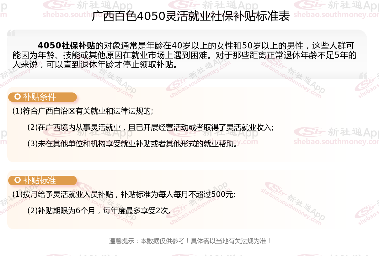 以上就是广西百色4050灵活就业社保补贴的相关内容,欢迎关注新社通/下载新社通APP了解更多五险一金专业资讯。