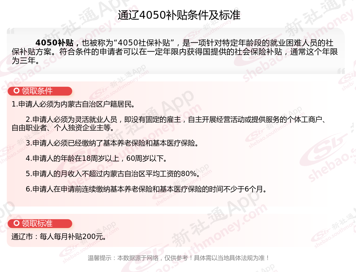 二、2025年通辽4050社保补贴标准及条件,最新如下: