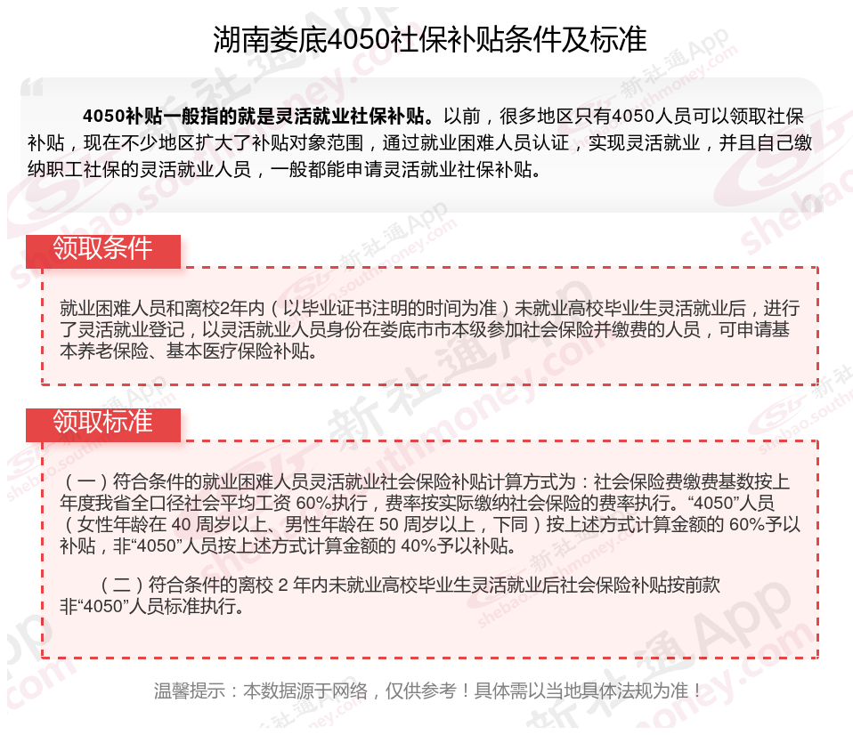 一、湖南娄底4050社保补贴标准是什么?附条件