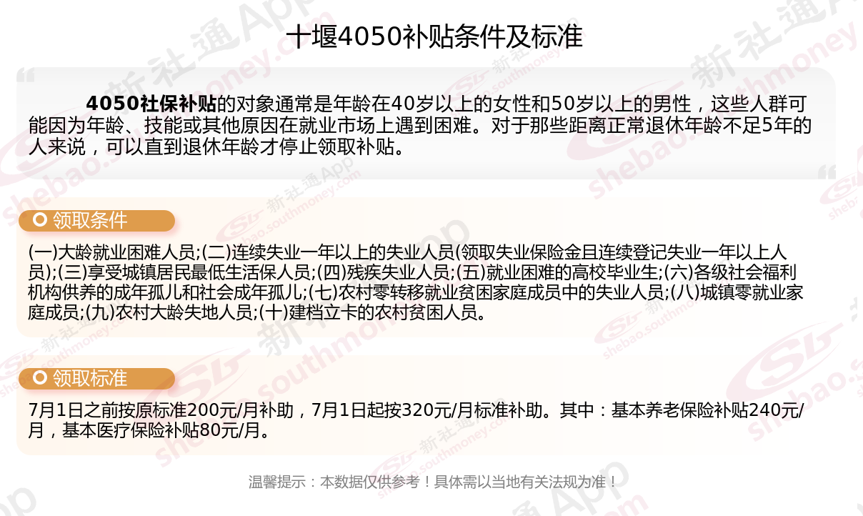 二、2025年十堰4050社保补贴标准及条件,最新如下: