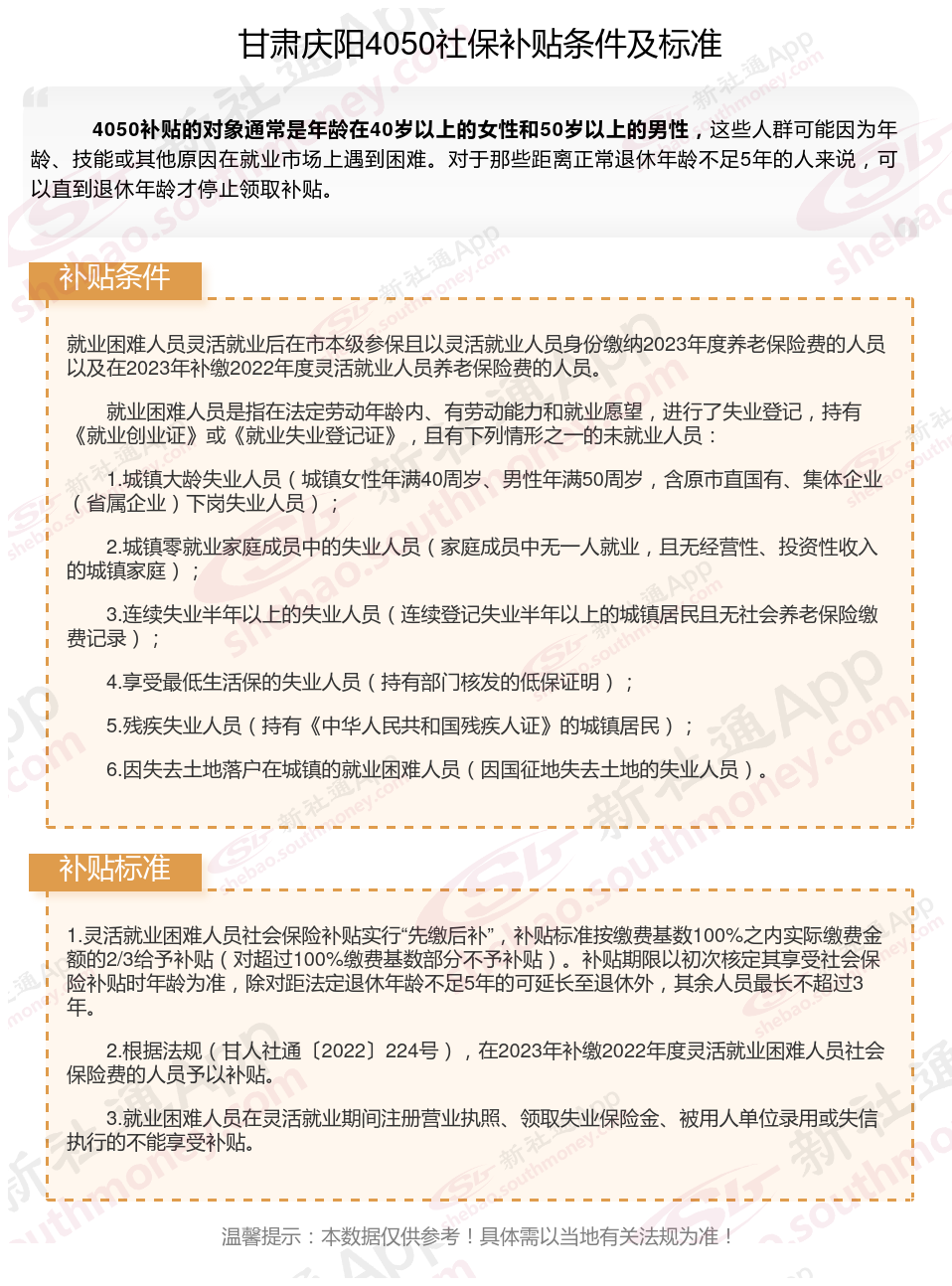 一、2025年甘肃庆阳灵活就业4050社保补贴标准及条件是什么
