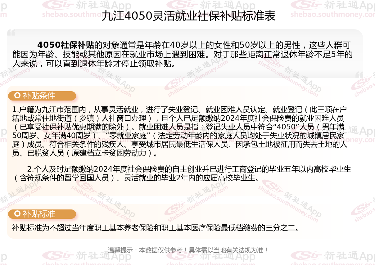 2025九江4050补贴主要针对的是年龄在40岁以上的女性和50岁以上的男性,这些人群通常因为年龄较大而面临就业困难。