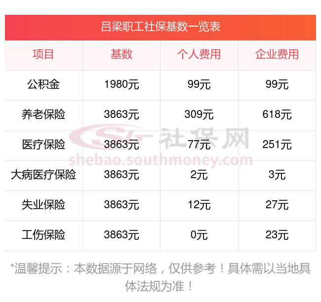据新社通app显示,吕梁社保缴费基数2023-2024年最新消息,吕梁职工社保缴费详情如下: