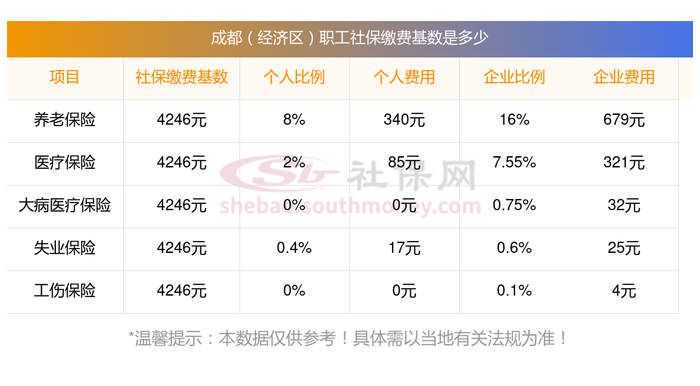 成都(经济区)社保缴费基数的计算公式:(1)单位缴费基数的计算公式为:单位缴费基数=单位工资总额×社保费率。其中,社保费率是根据不同的社会保险险种和缴费比例进行计算的。(2)个人缴费基数的计算公式为:个人缴费基数=职工上年度月平均工资。那么成都(经济区)职工个人需要缴纳多少?缴纳比例是多少?接下来随新社通APP小编一起了解最新社保缴费详情。