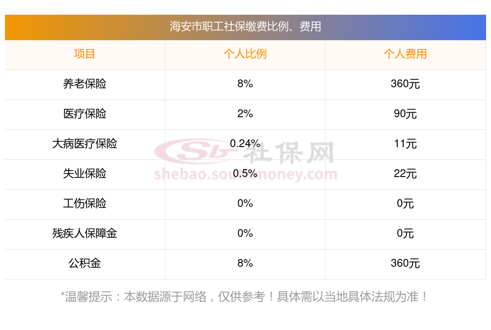 据新社通app显示,海安市社保缴费基数2023-2024年标准,(社保最低一个月要交多少钱)海安市社保费用如下:
