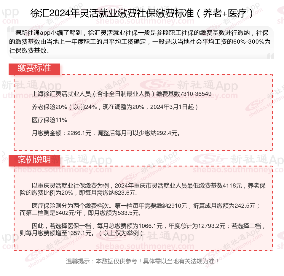 以上就是带来徐汇灵活就业社保缴费标准相关知识,内容供参考,希望对你有帮助,欢迎关注/下载新社通APP解锁更多社保专业资讯。
