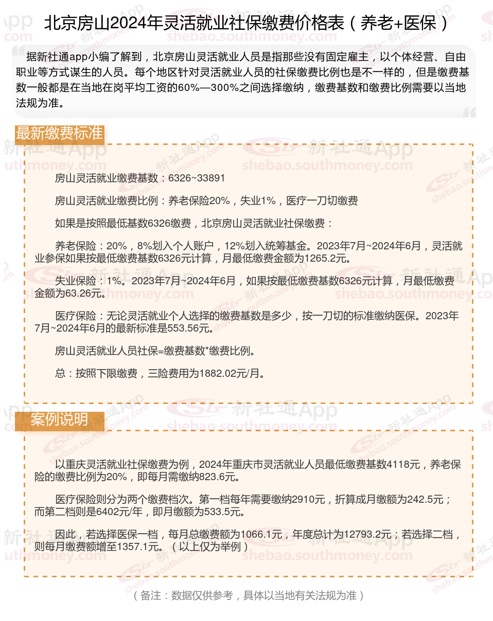 二、2024年北京房山灵活就业社保缴费标准表 北京房山灵活就业社保多少钱一个月?