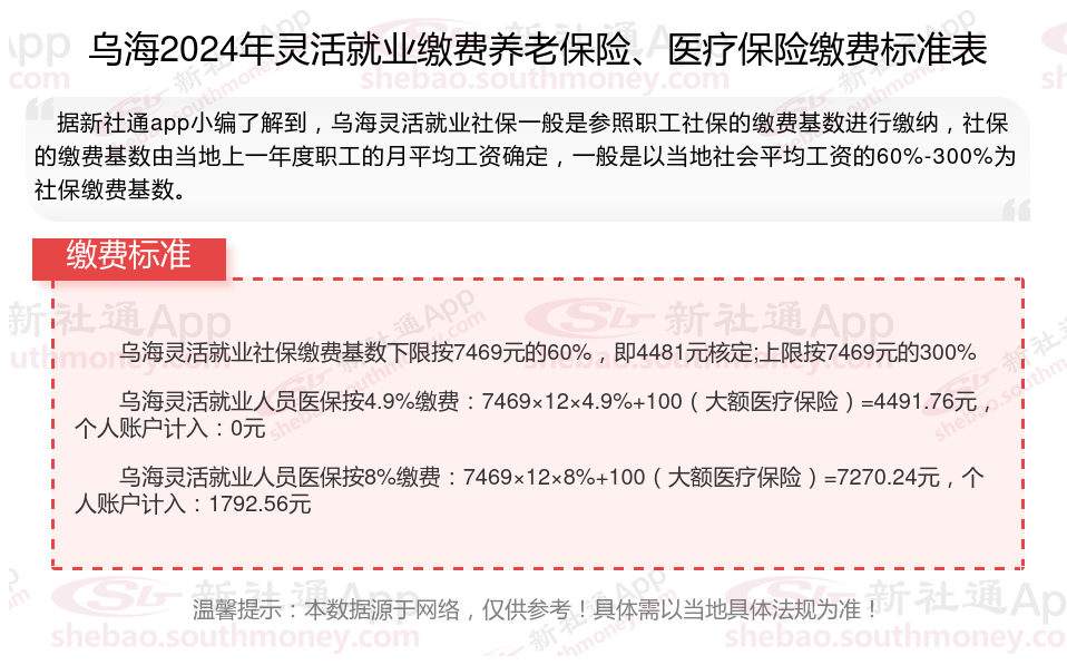 随着经济的发展和社会的进步,灵活就业人员越来越多,但是很多人不知道如何缴纳社保。本文将介绍2024年乌海灵活就业人员社保缴费基数及如何缴纳社保,能领取多少钱,帮助大家更好地了解灵活就业社保,随着新社通APP小编一起了解乌海灵活就业社保缴费最新资讯吧。
