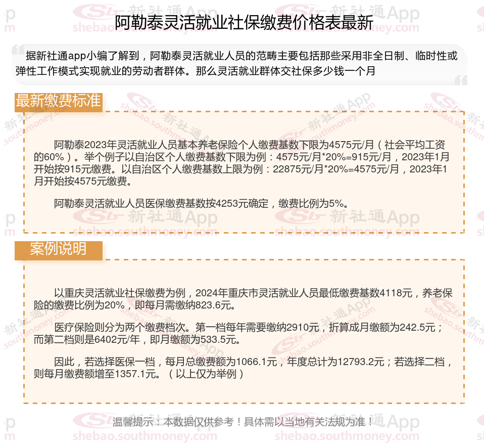 以上就是阿勒泰灵活就业社保缴费的全部内容,数据及内容供参考!希望对你有帮助,欢迎关注新社通app解锁更多社保专业资讯。