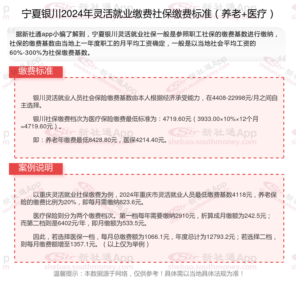 以上就是宁夏银川灵活就业社保缴费的全部内容,数据及内容供参考!希望对你有帮助,欢迎关注新社通解锁更多社保专业资讯。