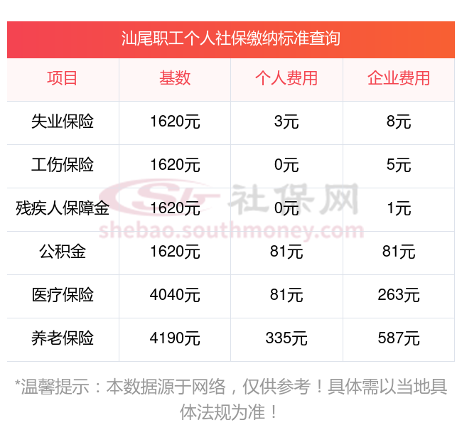 据新社通app显示,汕尾社保缴费基数2023-2024年标准,(社保最低一个月要交多少钱)汕尾社保费用如下: