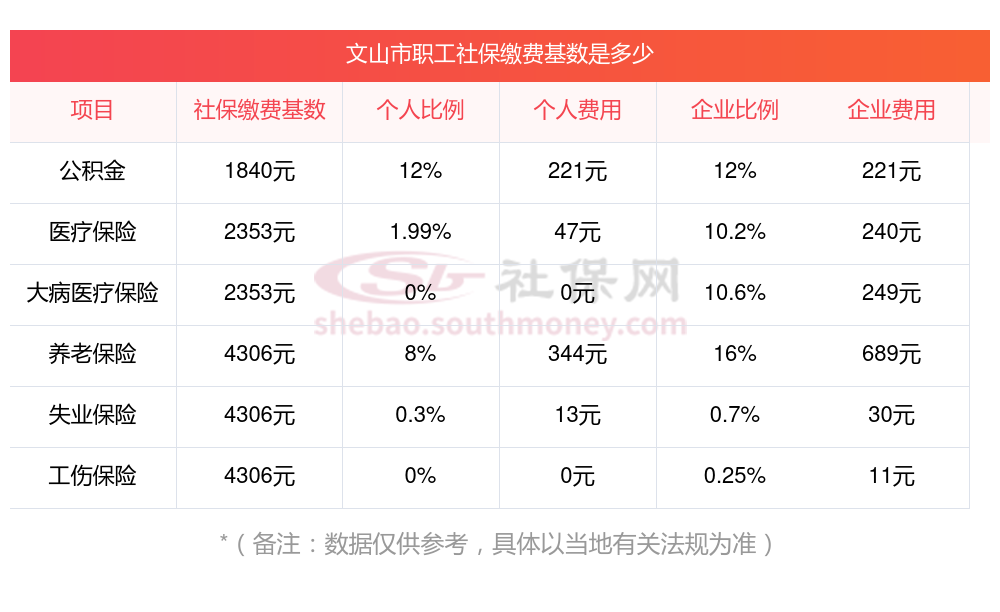 据新社通app小编了解到,2023-2024年文山市社保缴费基数参照为3579.00,文山市社保缴费明细如下: