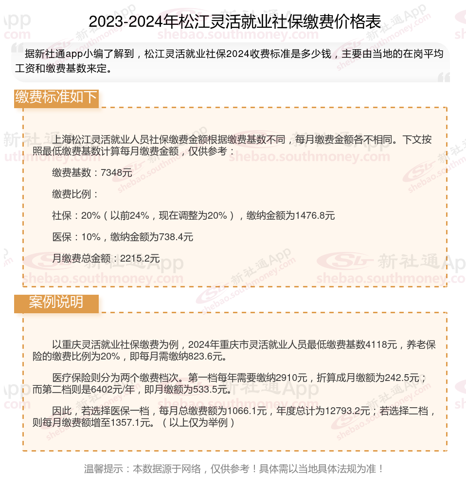 松江灵活就业社保2024收费标准是多少钱,主要由当地的在岗平均工资和缴费基数来定。其次,灵活就业社保缴纳跟职工缴纳不同的地方在于,灵活就业社保参保只能参保养老保险和医疗保险,且缴纳比例完全由个人承担。另外,灵活就业人员社保参保选择,可自由选择参保城镇职工社保和城乡居民保险。2024年松江灵活就业社保缴多少钱?如何缴纳?怎么计算待遇?新社通APP小编将在下文为您详细说明。