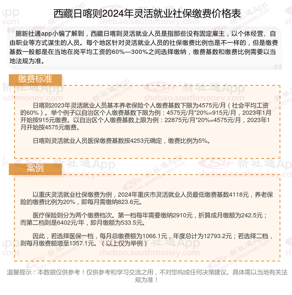 二、西藏日喀则2024年灵活就业社保缴费基数及比例最新消息