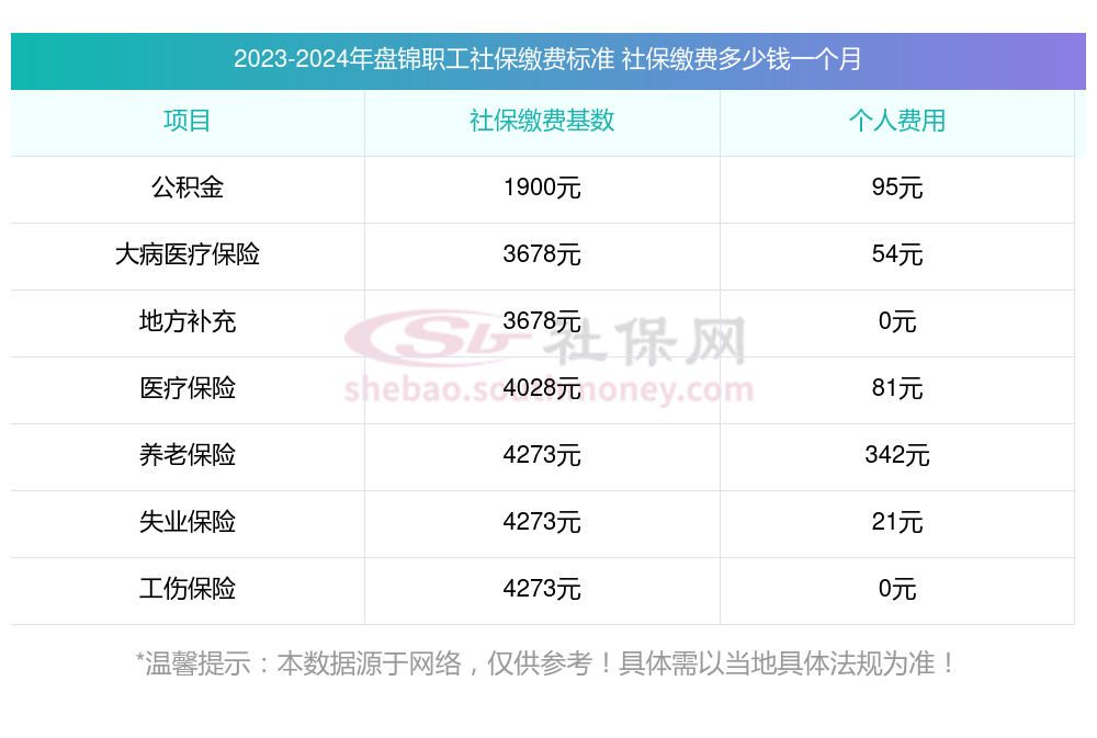 据新社通app显示,盘锦社保缴费基数2023-2024年最新消息,盘锦职工社保缴费详情如下: