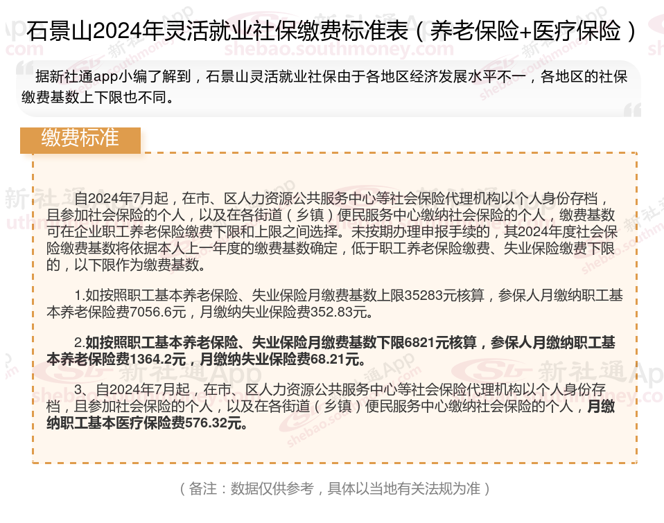 一、2024年石景山灵活就业社保缴费标准表 石景山灵活就业社保多少钱一个月?