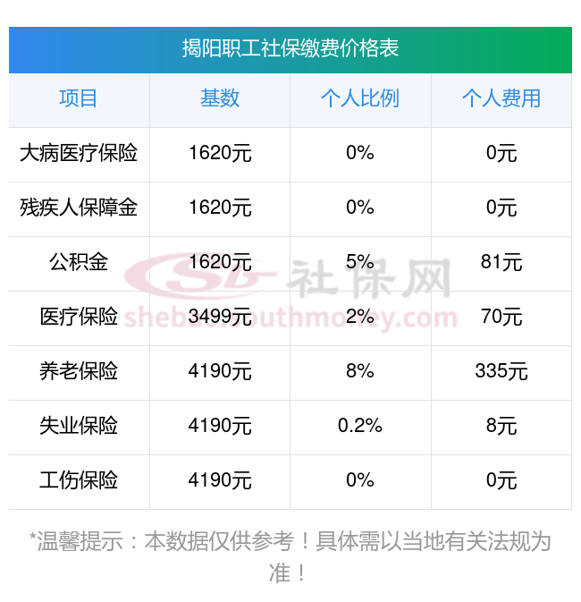 据新社通app小编了解到,2023-2024年揭阳社保缴费基数参照为3579.00,揭阳社保缴费明细如下: