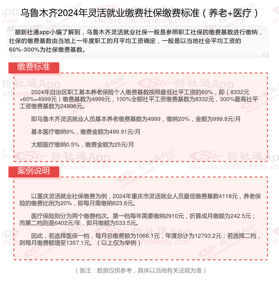 乌鲁木齐灵活就业社保2024收费标准是多少钱,主要由当地的在岗平均工资和缴费基数来定。其次,灵活就业社保缴纳跟职工缴纳不同的地方在于,灵活就业社保参保只能参保养老保险和医疗保险,且缴纳比例完全由个人承担。另外,灵活就业人员社保参保选择,可自由选择参保城镇职工社保和城乡居民保险。2024年乌鲁木齐灵活就业社保缴多少钱?如何缴纳?怎么计算待遇?新社通APP小编将在下文为您详细说明。