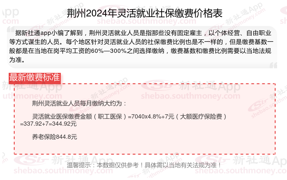 随着经济的发展和社会的进步,灵活就业人员越来越多,但是很多人不知道如何缴纳社保。本文将介绍2024年荆州灵活就业人员社保缴费基数及如何缴纳社保,能领取多少钱,帮助大家更好地了解灵活就业社保,随着新社通APP小编一起了解荆州灵活就业社保缴费最新资讯吧。