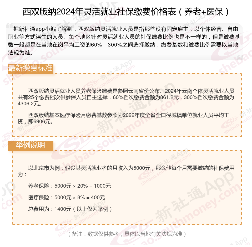 二、西双版纳2024年灵活就业社保缴费基数、比例最新消息