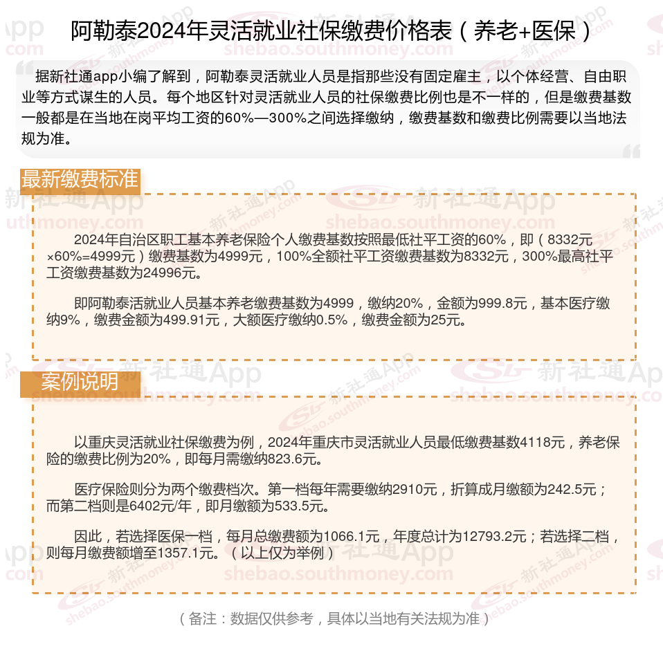 以上就是阿勒泰灵活就业社保缴费的全部内容,数据及内容供参考!希望对你有帮助,欢迎关注新社通app解锁更多社保专业资讯。