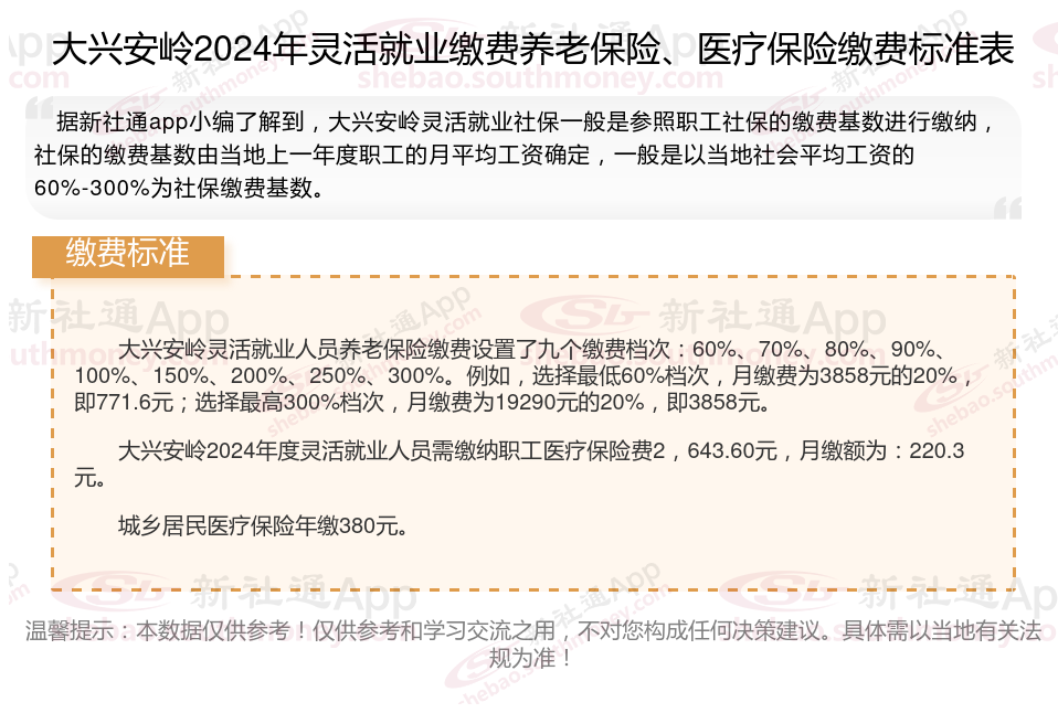 以上就是大兴安岭灵活就业社保缴费的全部内容,数据及内容供参考!希望对你有帮助,欢迎关注新社通解锁更多社保专业资讯。
