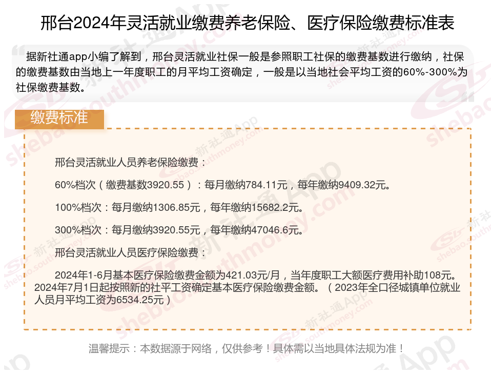 以上就是邢台灵活就业社保缴费的全部内容,数据及内容供参考!希望对你有帮助,欢迎关注新社通app解锁更多社保专业资讯。