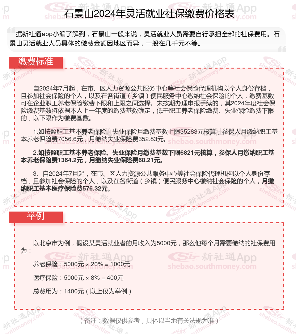 对于灵活就业者来说,社保缴纳是一个非常重要的问题。那么,2024年石景山灵活就业社保怎么交?一个月要交多少呢?领取待遇如何计算的?接下来随新社通APP小编一起了解石景山灵活就业社保缴费具体详情吧。