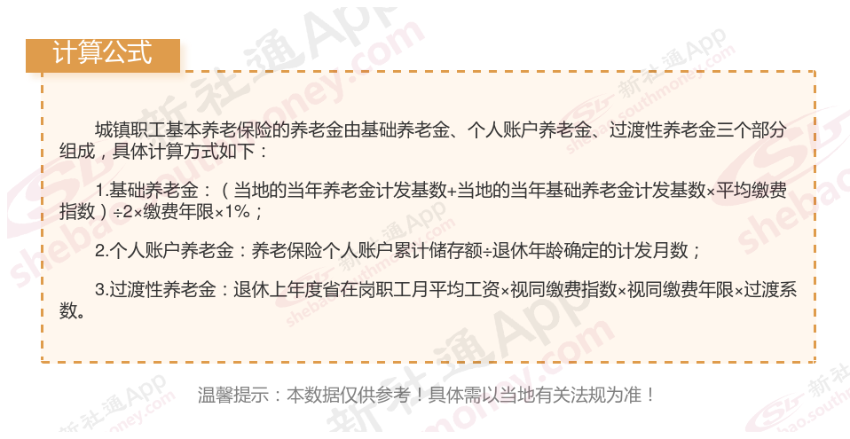 基础养老金为:上一年退休地在岗职工月平均工资(1 个人平均缴费指数)÷2×累计缴费年限(含视为缴费年限)×1%。