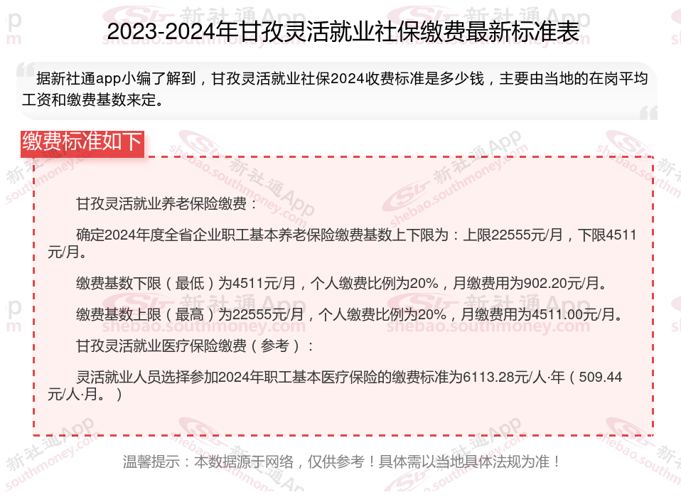 以上就是带来甘孜灵活就业社保缴费标准相关知识,内容供参考,希望对你有帮助,欢迎关注/下载新社通app解锁更多社保专业资讯。