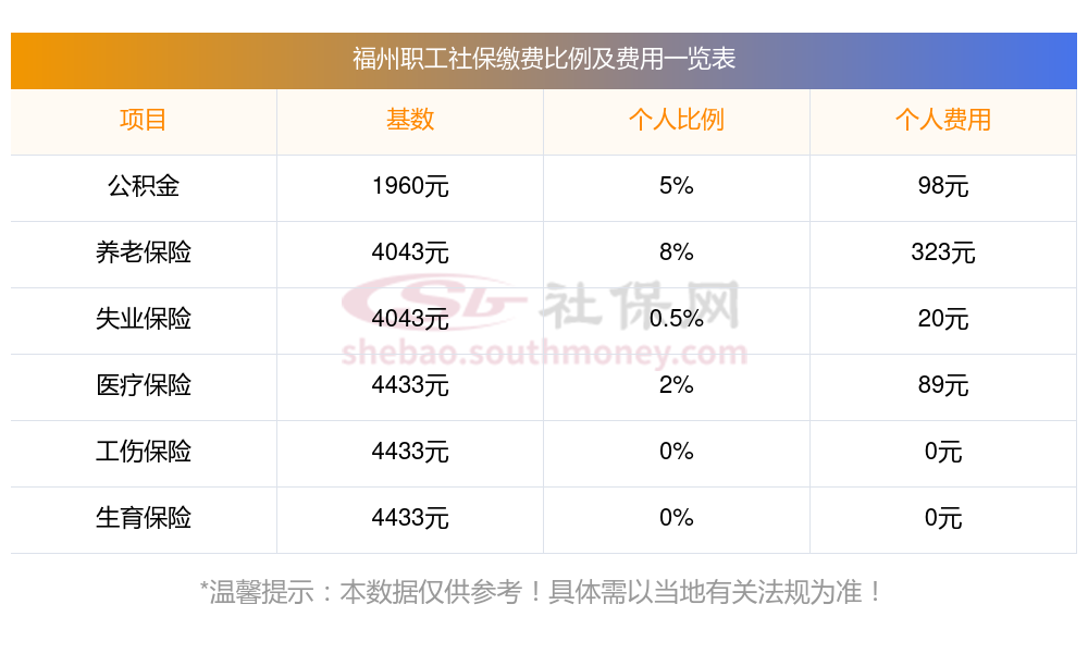 2025年福州社保缴费多少钱?下表是2024-2025年福州社保费用明细参考,新社通app-社保缴费查询工具提供的最新数据如下: