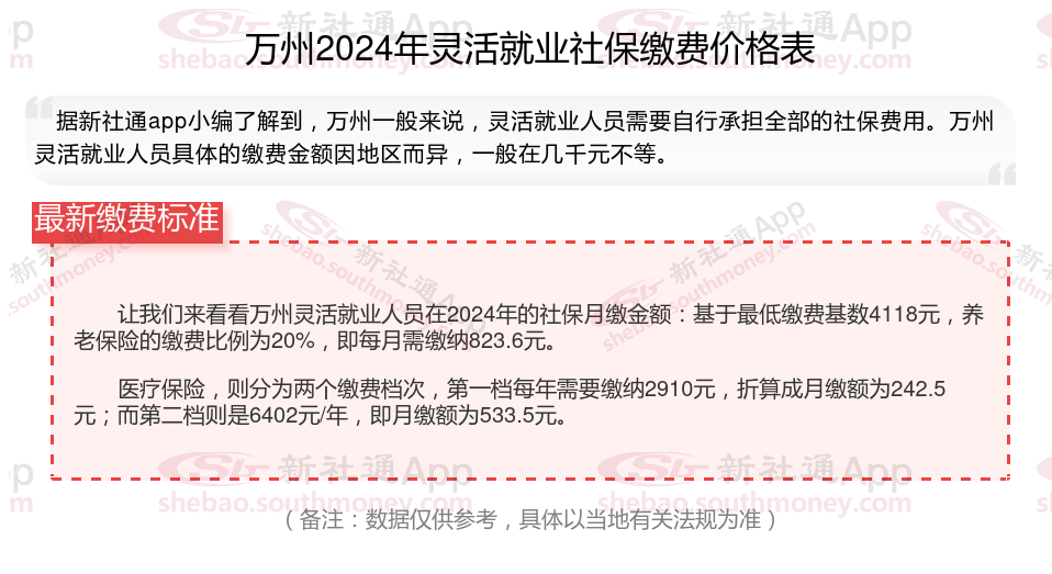 随着经济的发展和社会的进步,灵活就业人员越来越多,但是很多人不知道如何缴纳社保。本文将介绍2024年万州灵活就业人员社保缴费基数及如何缴纳社保,能领取多少钱,帮助大家更好地了解灵活就业社保,随着新社通APP小编一起了解万州灵活就业社保缴费最新资讯吧。