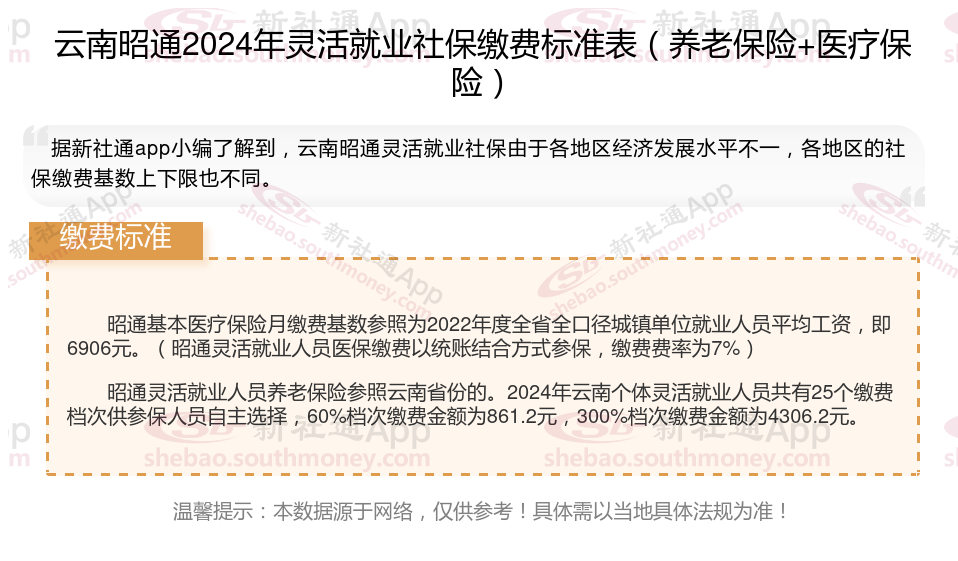 以上就是云南昭通灵活就业社保缴费的全部内容,数据及内容供参考!希望对你有帮助,欢迎关注新社通app解锁更多社保专业资讯。