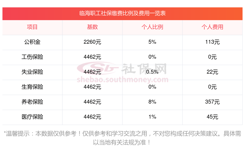 临海职工社保缴费多少钱?临海职工社保缴费基数最新参考为:3579.00,具体如下:
